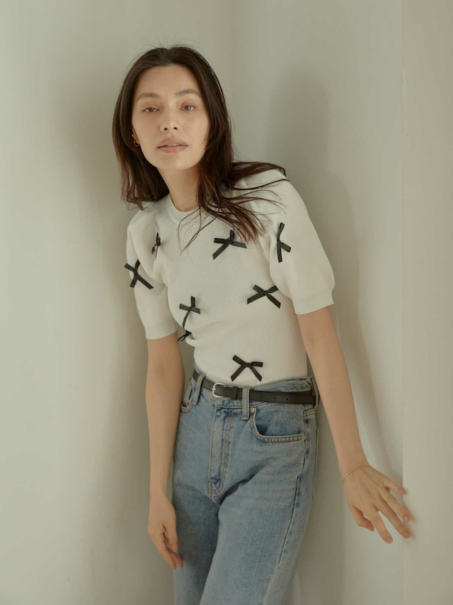 【COMMENT】 ■デザイン トレンドのリボンデザインを施したパフスリーブニットです。 シンプルなボディながら、サテンリボンがコーディネートのポイントに。 ■素材感 さらりとした肌触りのサマーニット素材です。 ■スタイリング リボンデザインが甘めな印象なので、デニム等でカジュアルな雰囲気にも、スラックスやロングスカート合わせで女性らしいコーディネートもおすすめです。 ============================ 季節感:春・夏・秋 サイズ感:適度 裏地:なし 透け感:なし 厚み感:適度 肌触り:さらっと 伸縮性:あり 光沢感:なし 重厚感:軽い ============================ 【PRODUCT】 ポリエステル100%