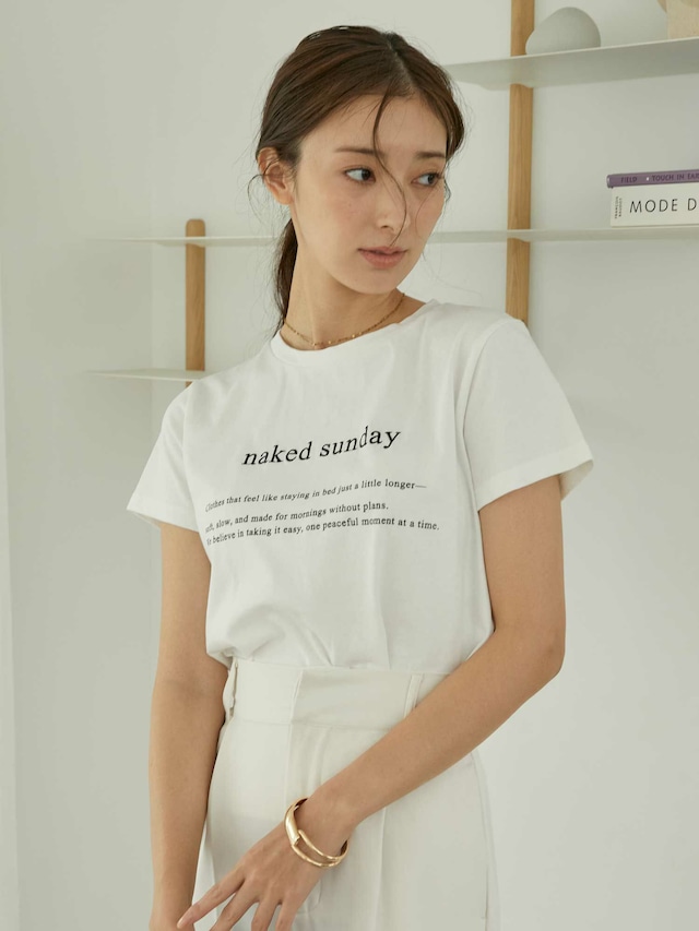 【COMMENT】 ■デザイン ACYMオリジナルのロゴTシャツです。 モノトーンなカラーリングとさらりとした生地感で、カジュアルになりがちなロゴTシャツも綺麗めな雰囲気に。 コンパクトなサイズ感も女性らしく見えるポイントです。 ■素材感 つるりとした肌触りのコットンです。 ■スタイリング モノトーンな配色なので、ボトムスや羽織の色合わせを選ばずにお使いいただけます。 暑い時期にはスラックスやロングスカート合わせでさらりと、春や秋など季節の変わり目にはジャケットやニットカーディガンのインナーとしてもおすすめの一枚です。 ============================ 季節感:オールシーズン サイズ感:スリムフィット 裏地:なし 透け感:ホワイトのみややあり 厚み感:薄手 肌触り:さらっと 伸縮性:あり 光沢感:なし 重厚感:軽い ============================ 【PRODUCT】 コットン100%