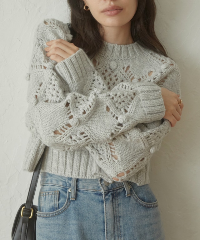 【COMMENT】 ■デザイン 透かし網みが今年らしいデザインニット。 ざっくりとした透け感を活かしてインナーとのレイヤードコーディネートを楽しめます。 ショート丈で様々なボトムと好相性で着こなせます。 ■素材感 ふわふわとした、柔らかな肌触りのニット生地です。 ■スタイリング シンプルながらも存在感のあるデザインで、お手持ちのボトムスにウエストアウトでさらっと合わせて頂くだけで決まる一枚。 カジュアルにデニムで合わせる着こなしや、マーメイドシルエットのスカートを合わせると、トレンドライクでレディなスタイリングに仕上がります。 ============================ 季節感:秋・冬 サイズ感:ルーズフィット 裏地:なし 透け感:あり 厚み感:厚手 肌触り:ふわふわ 伸縮性:なし 光沢感:なし 重厚感:適度 ============================ 【PRODUCT】 アクリル80%、ナイロン8%、ポリエステル7%、毛5%