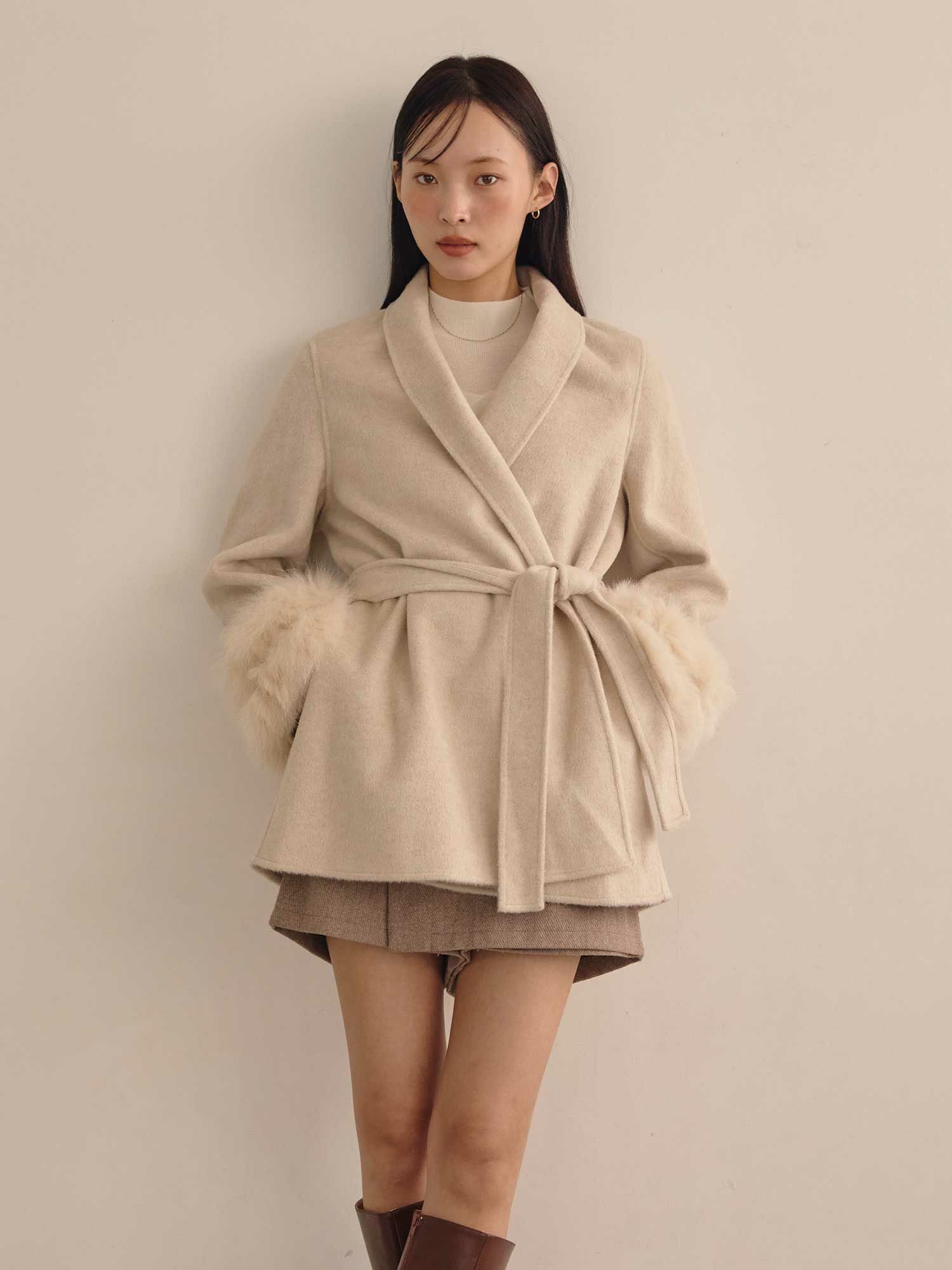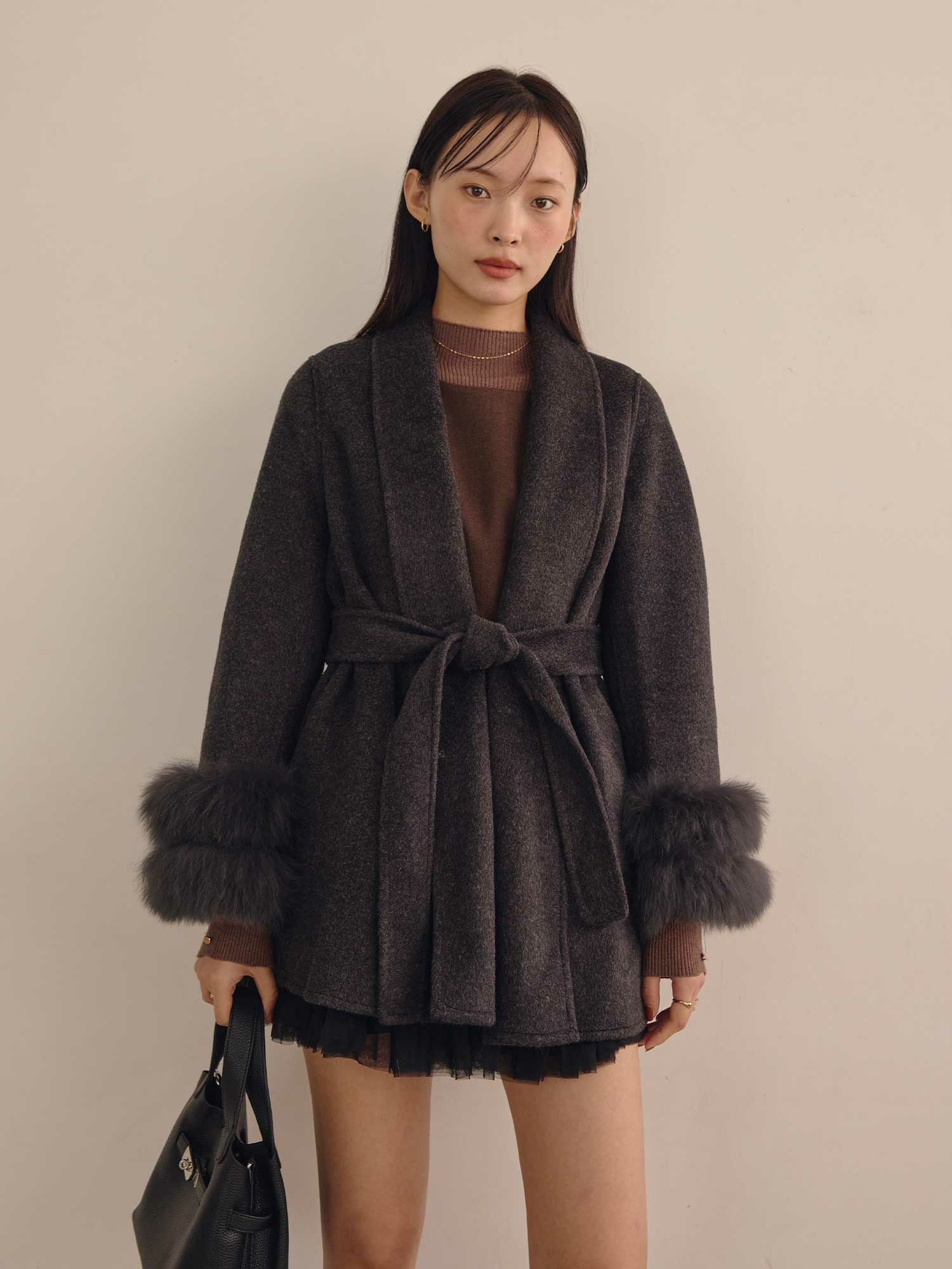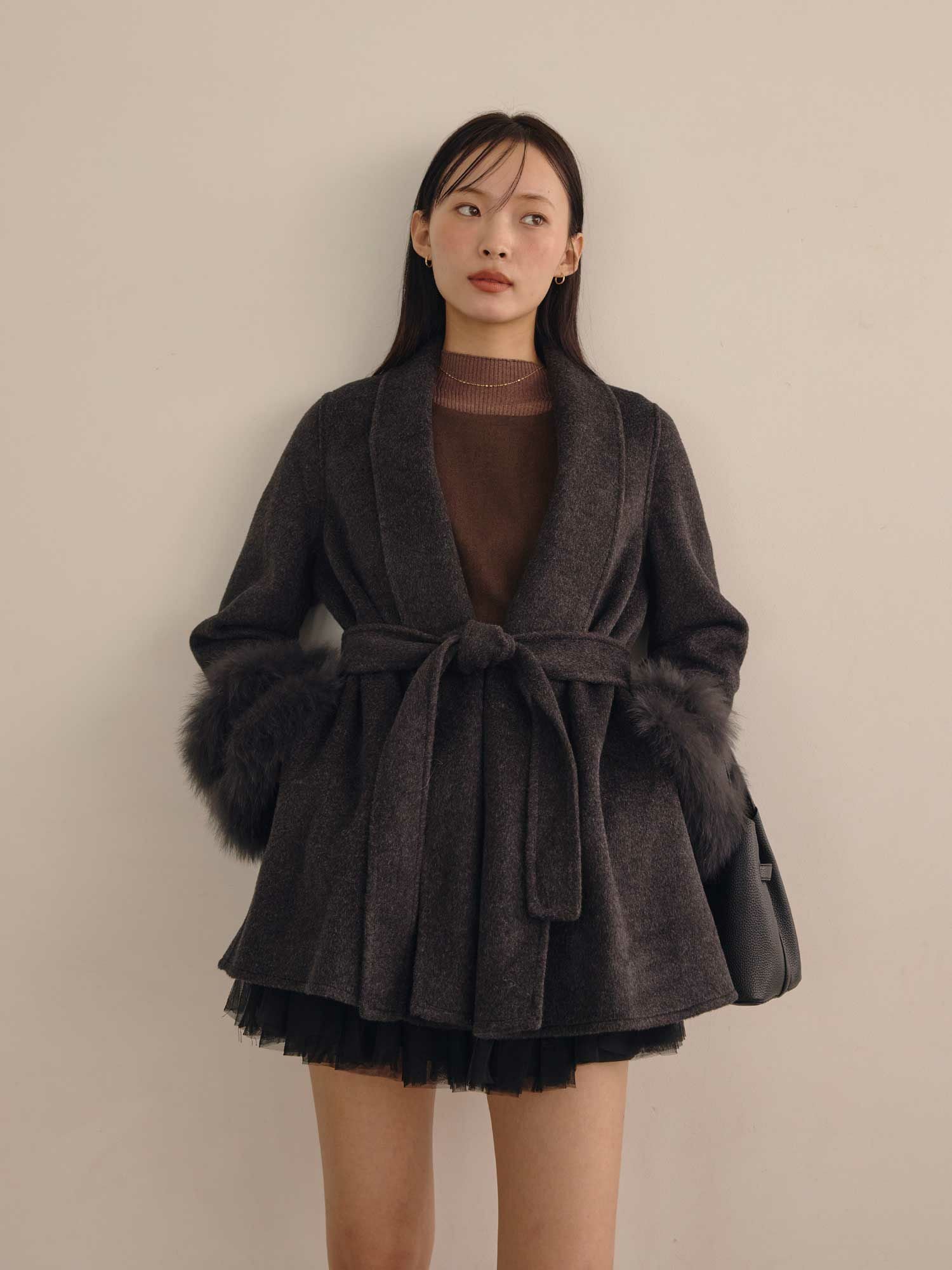 ショールカラーデザインと袖元のファーデザインがポイントのウールコートです。