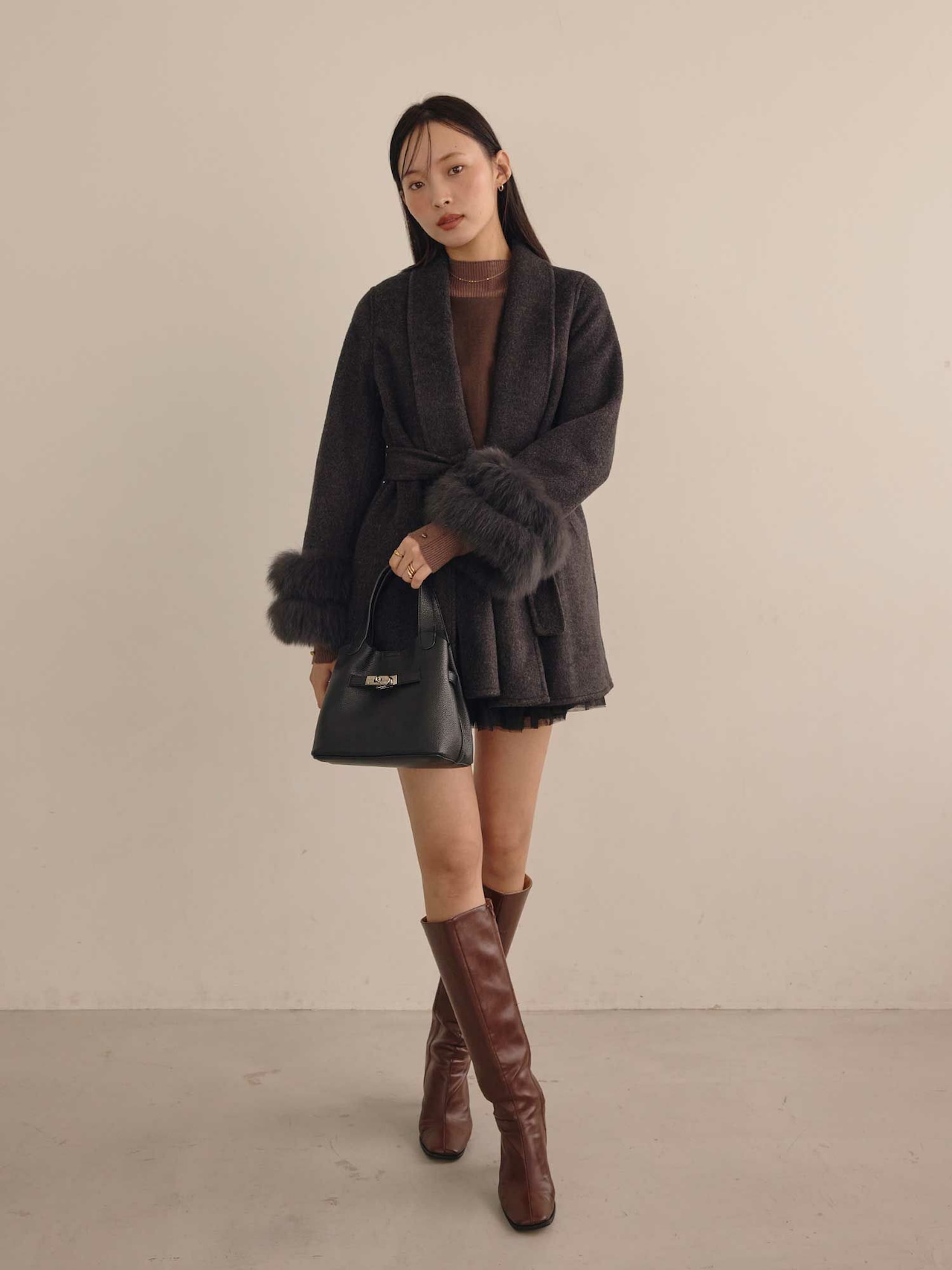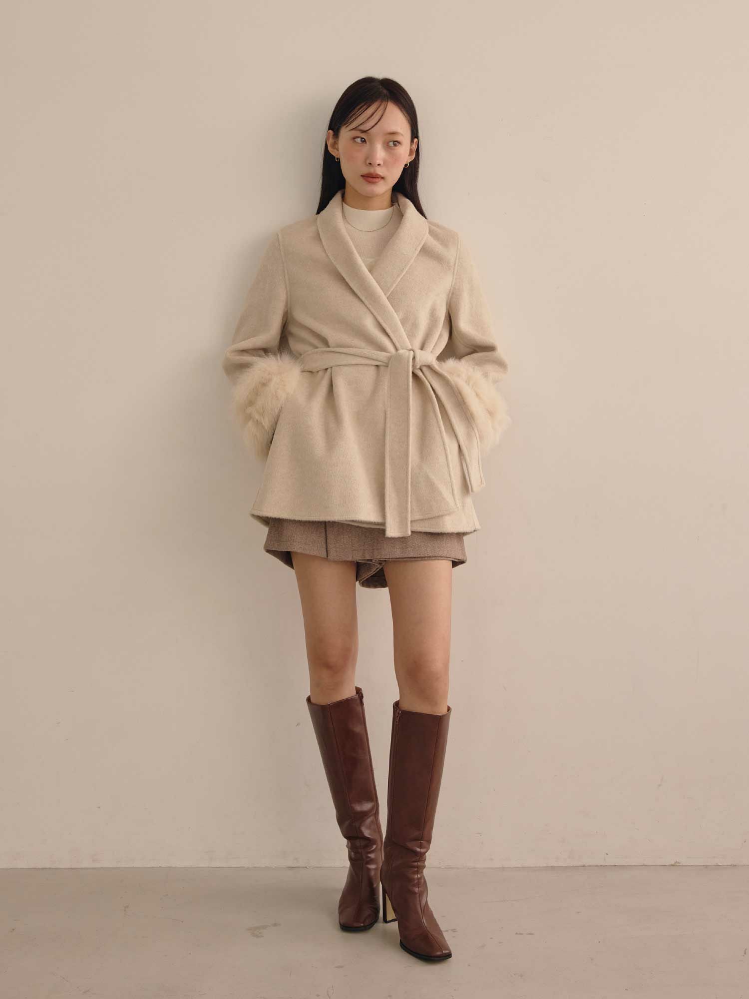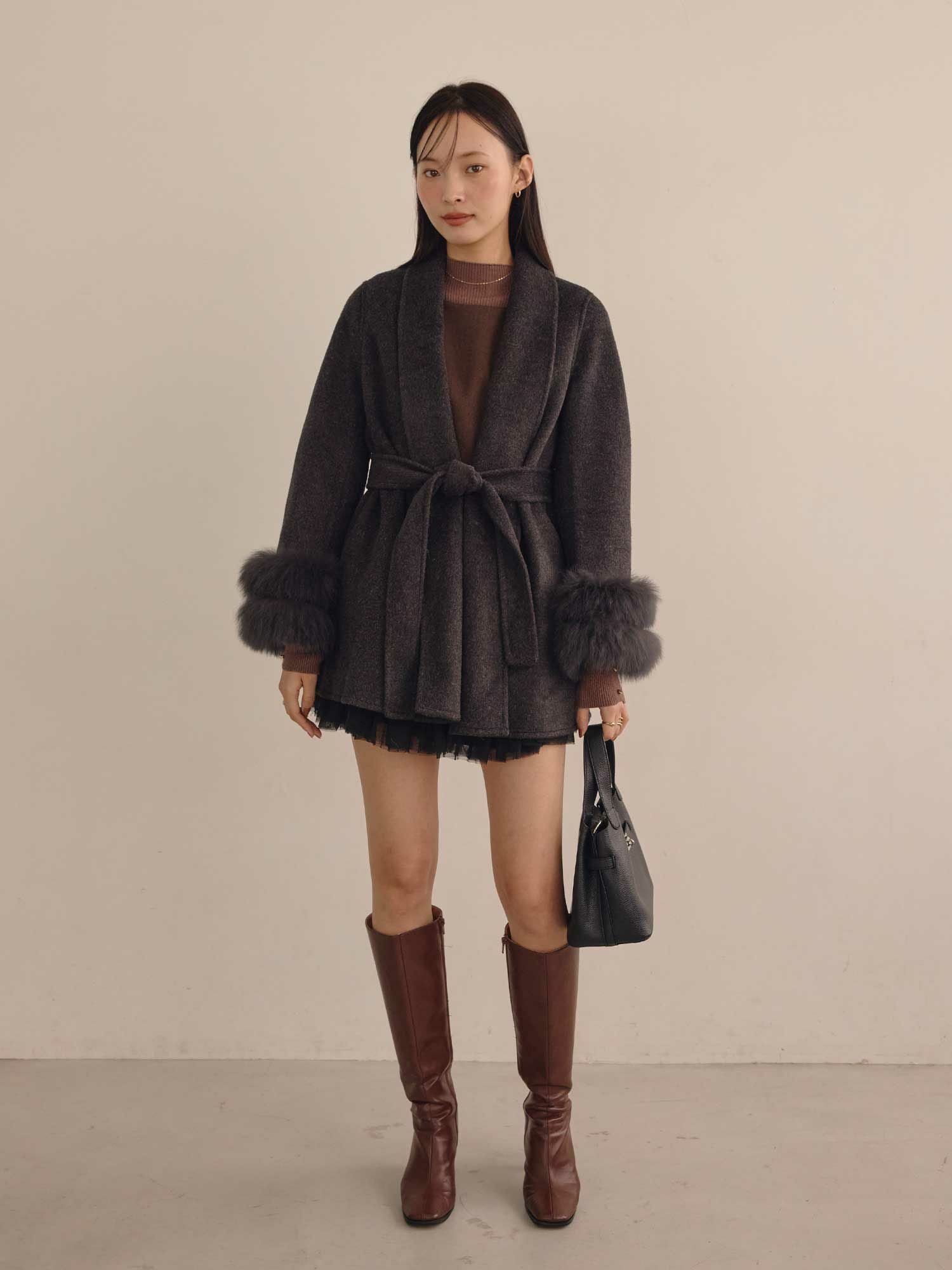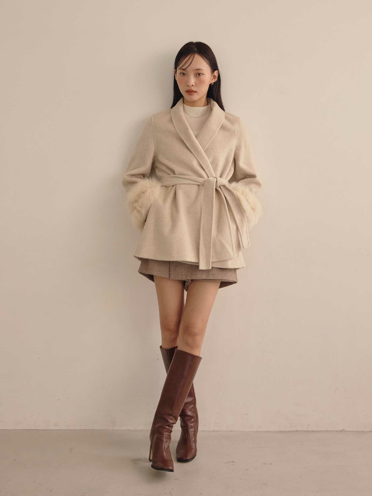 ショールカラーデザインと袖元のファーデザインがポイントのウールコートです。
