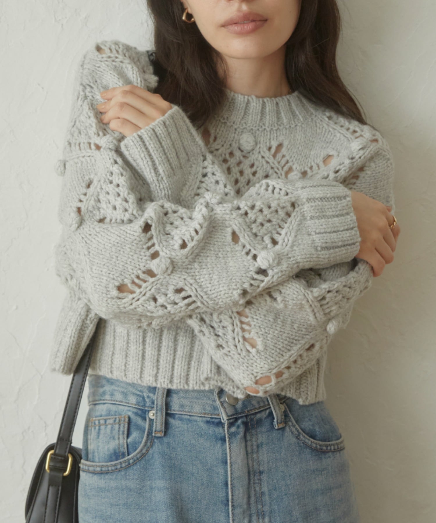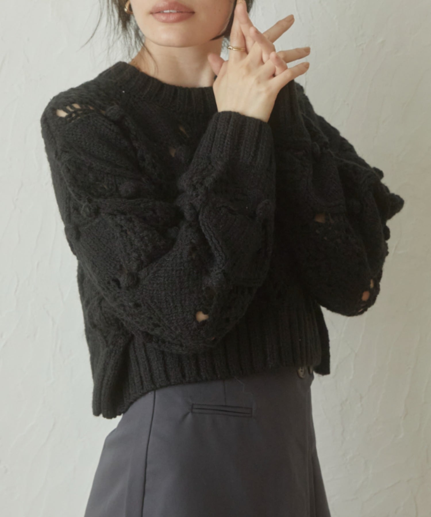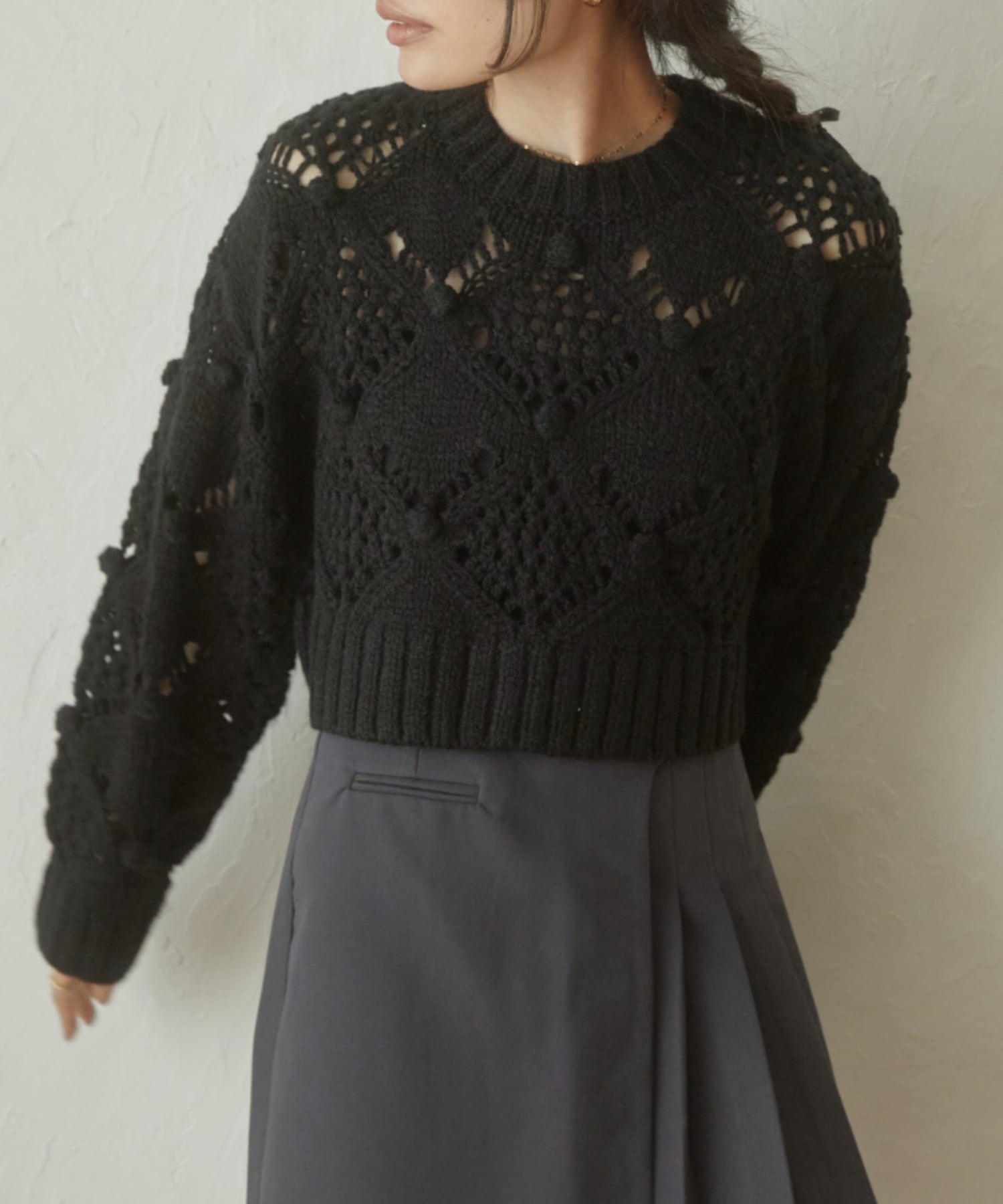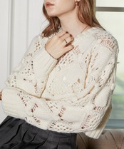 透かし網みが今年らしいデザインニット。