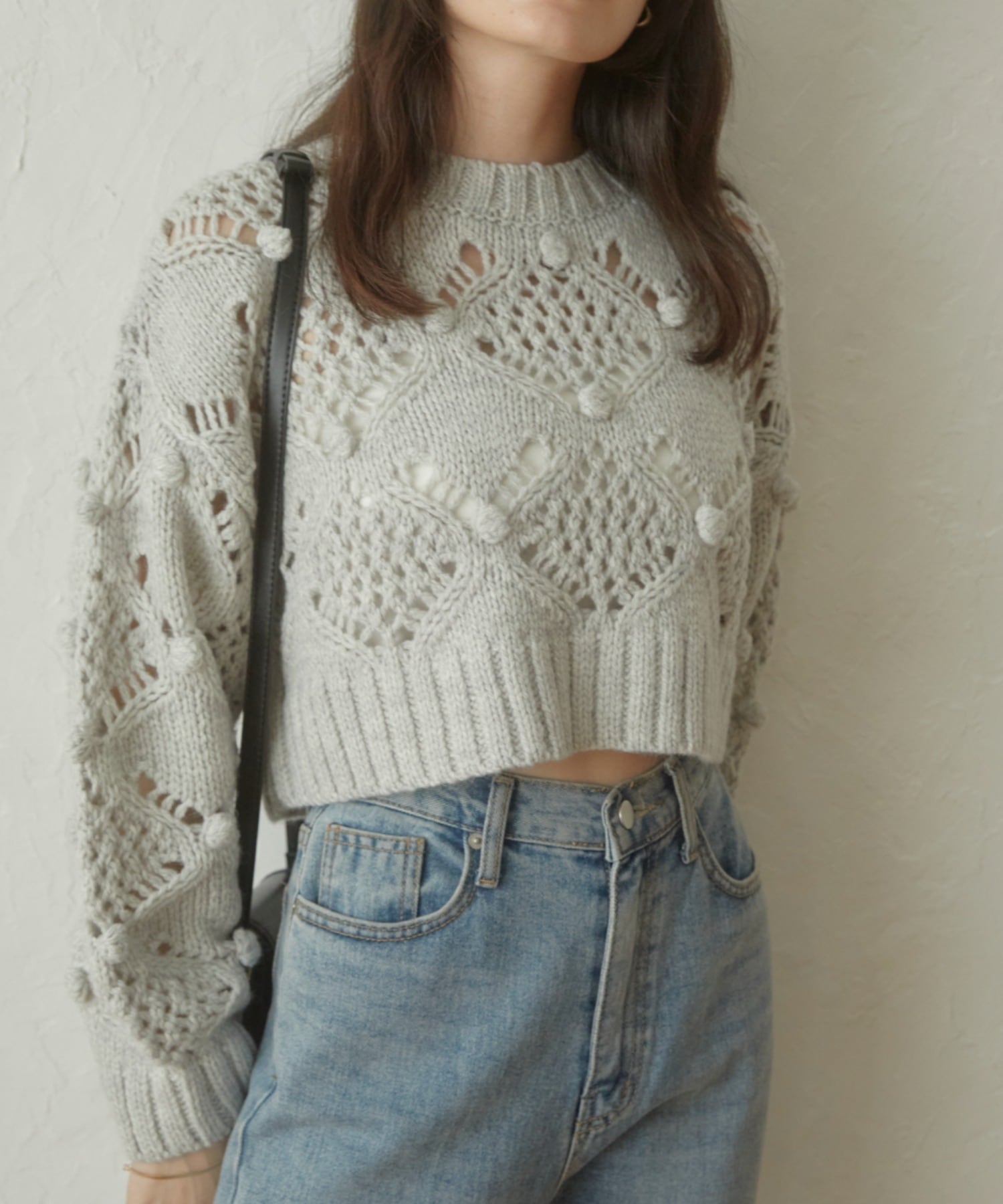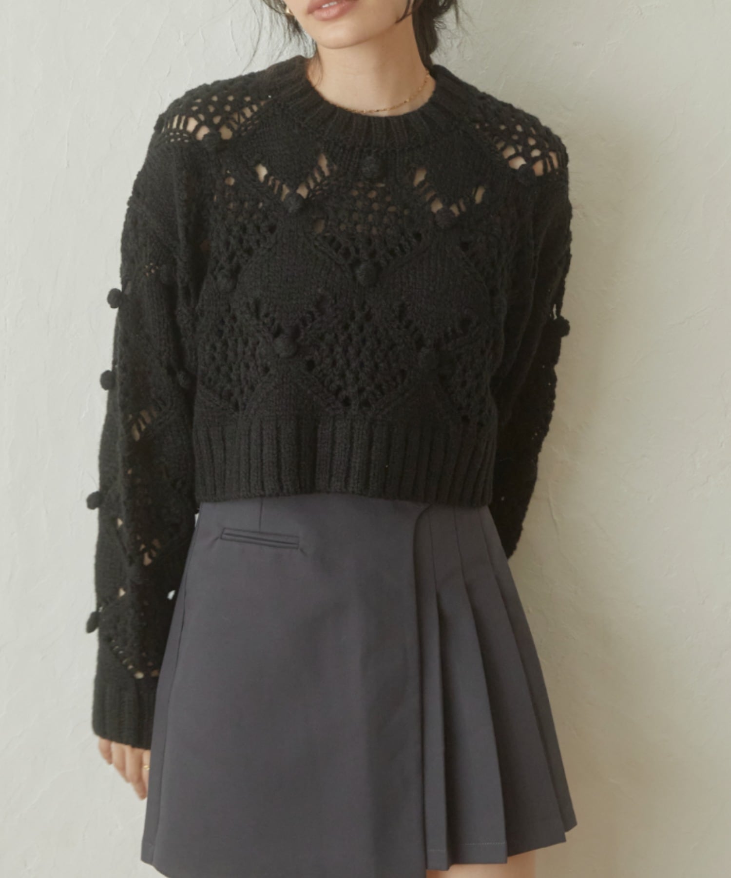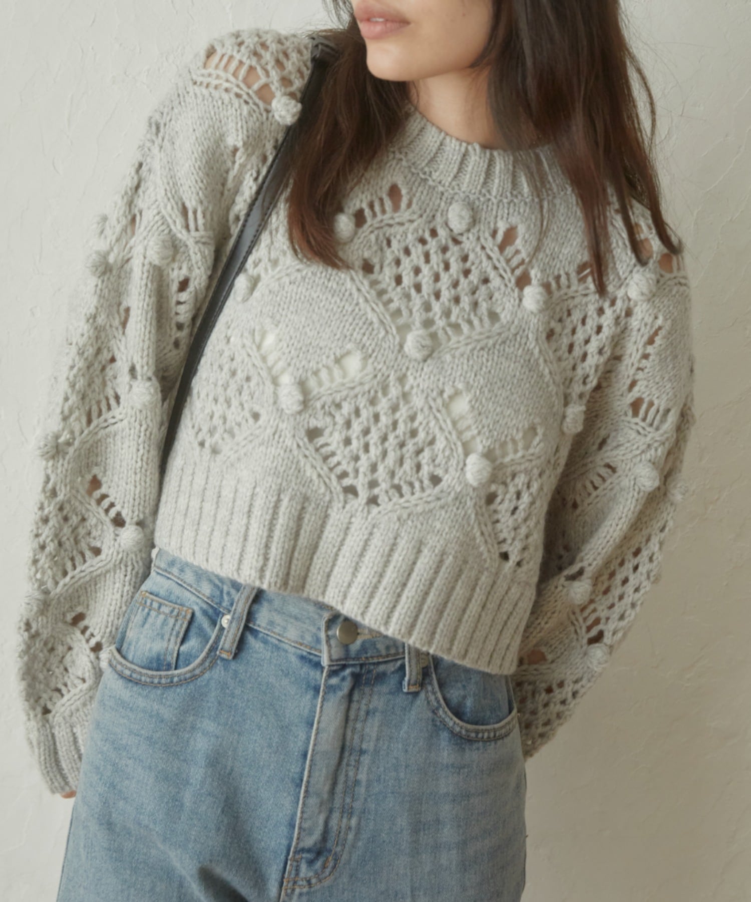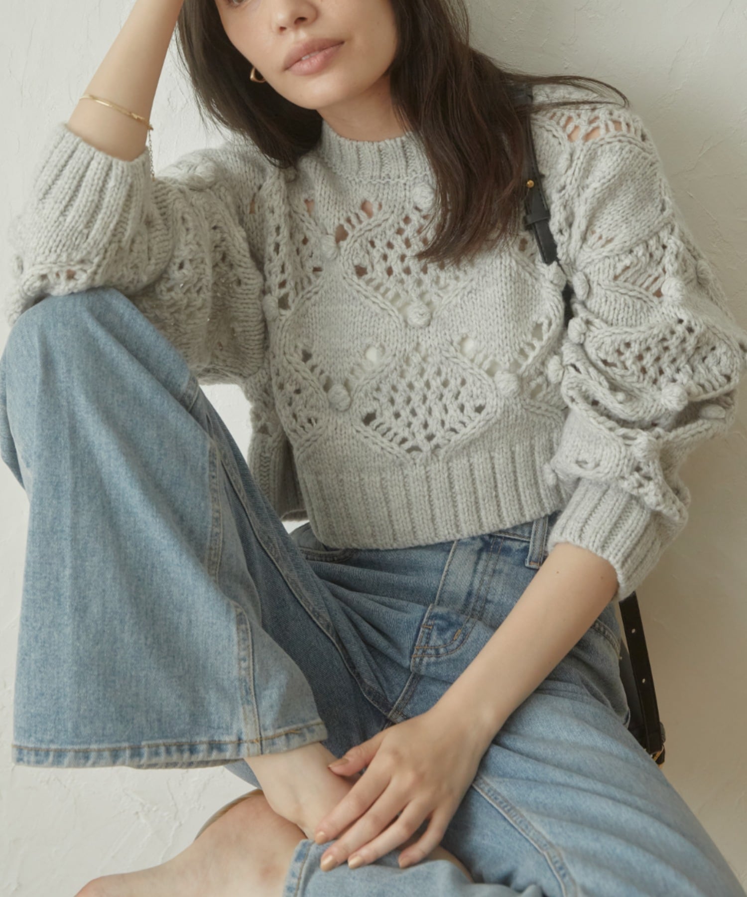 透かし網みが今年らしいデザインニット。