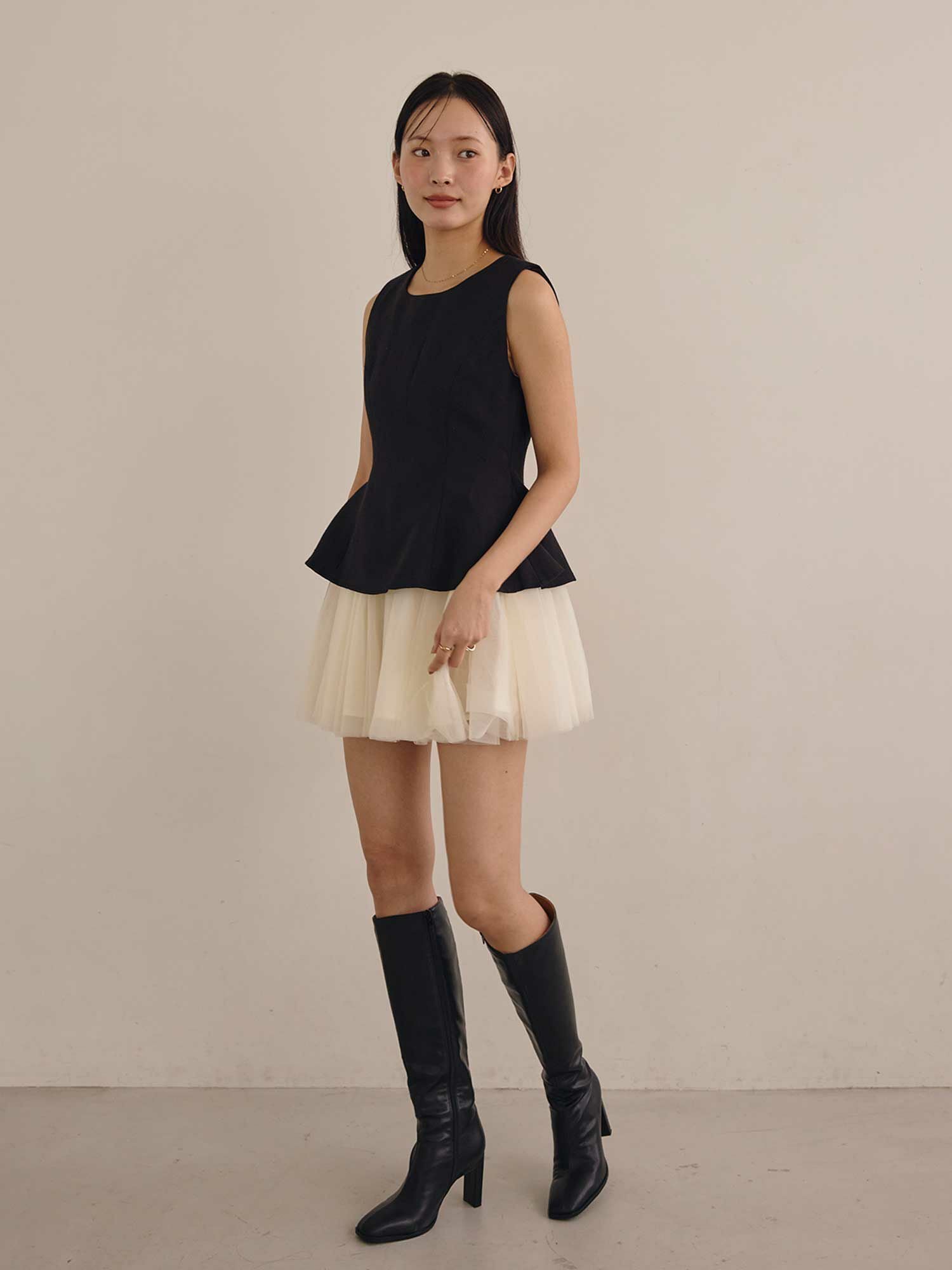 ミニボトムスとの合わせはもちろん、フルレングスパンツを重ねたブーツインスタイルも◎