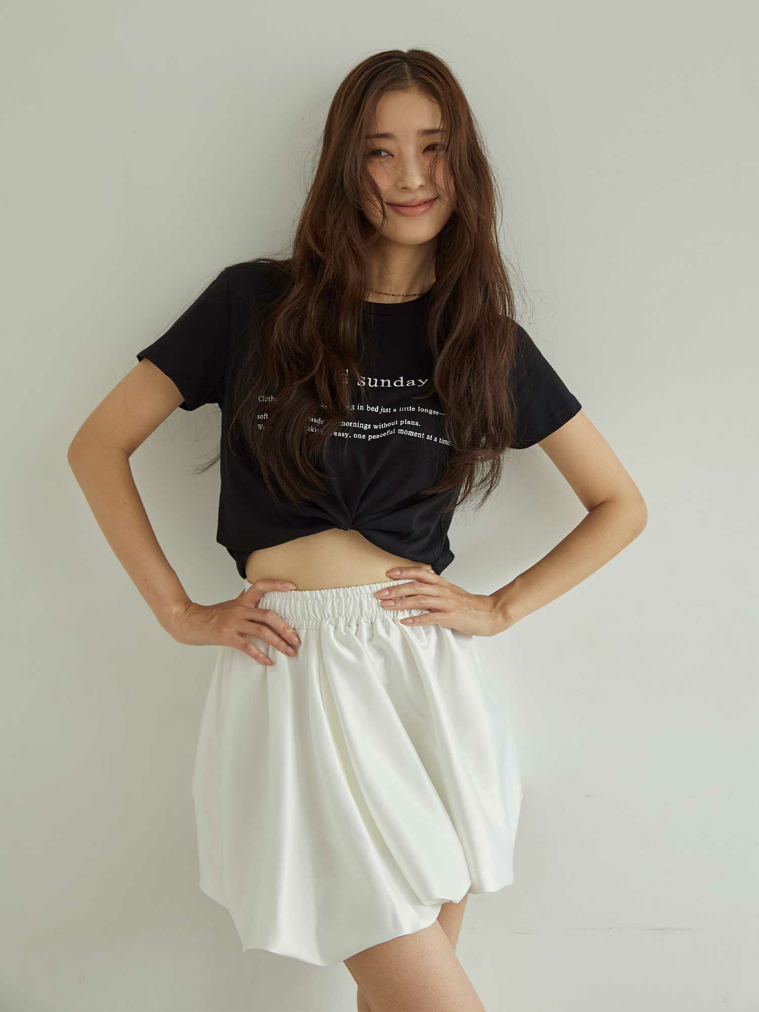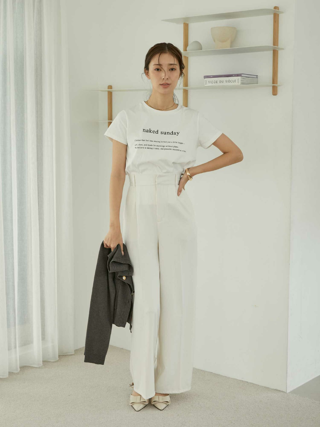 モノトーンなカラーリングとさらりとした生地感で、カジュアルになりがちなロゴTシャツも綺麗めな雰囲気に。
