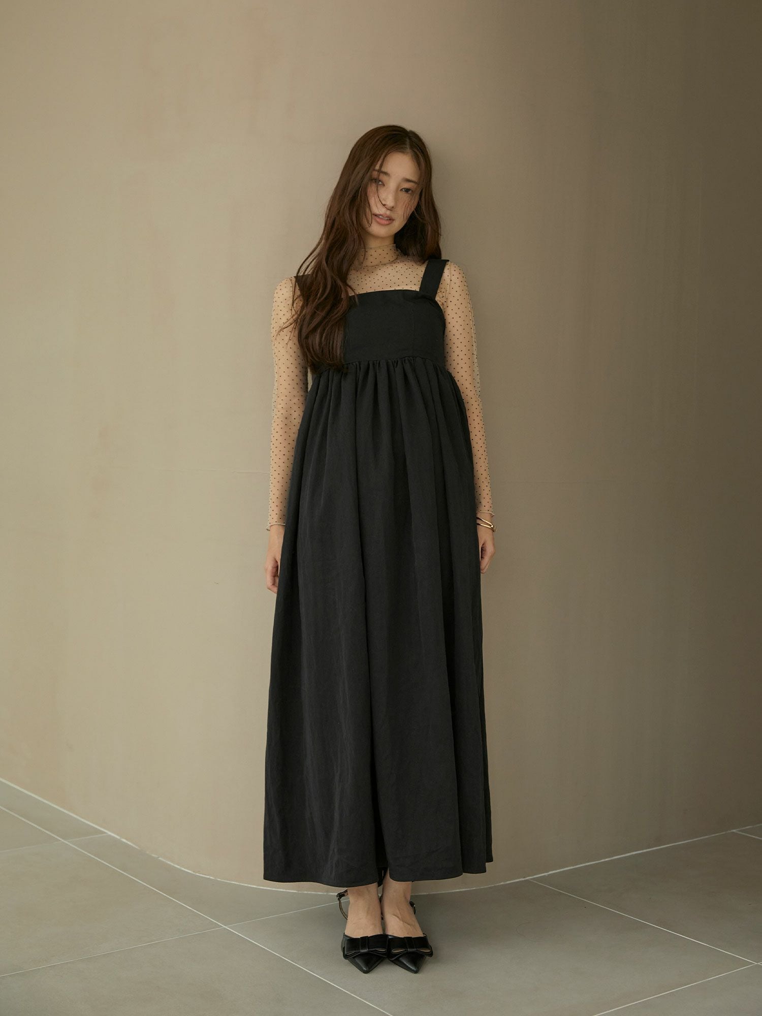 ビスチェ型なので暑い時期には一枚で寒い時期にはカットソーやニット、ブラウスなどインナーのレイヤードで雰囲気を変えてお楽しみいただけます。